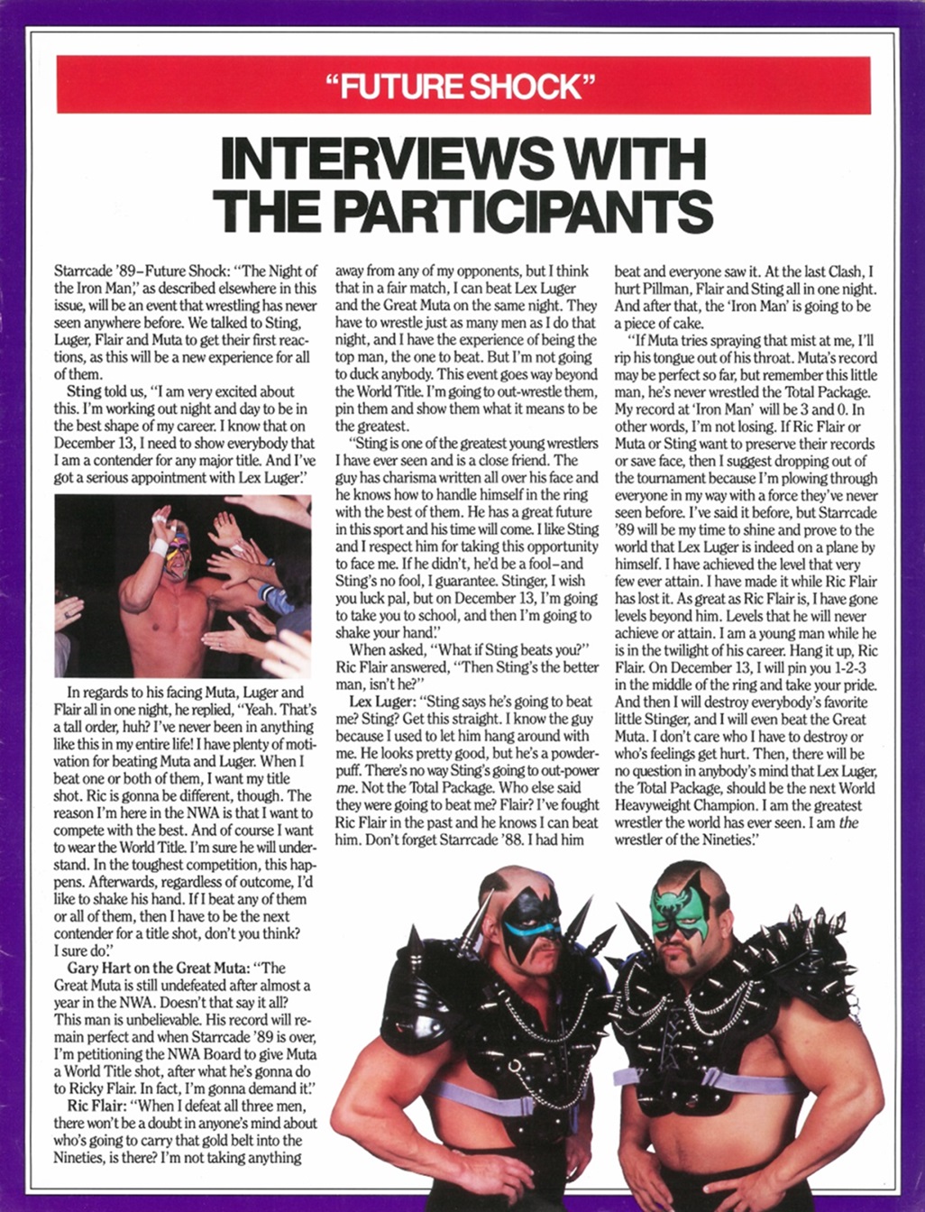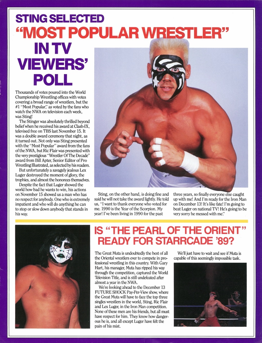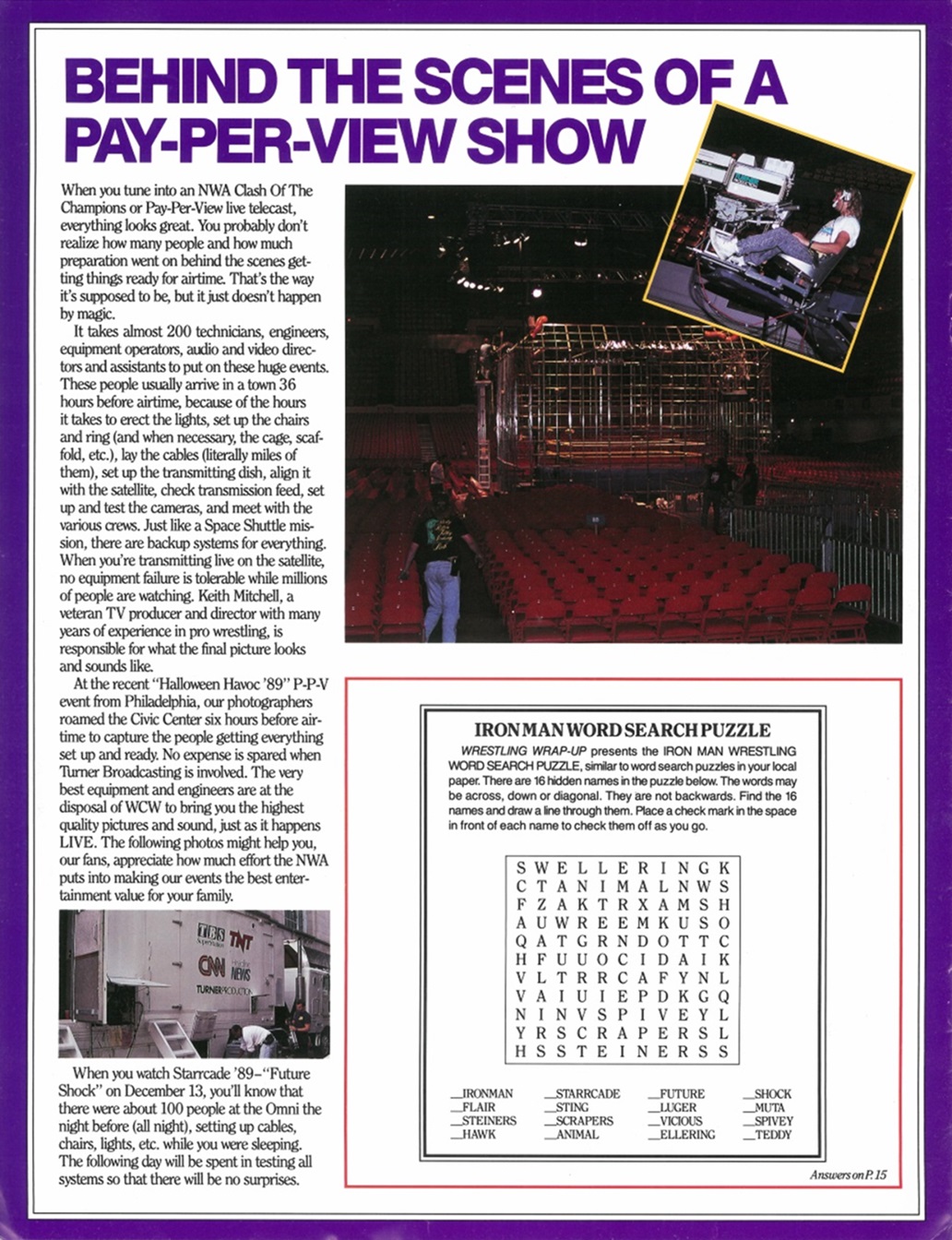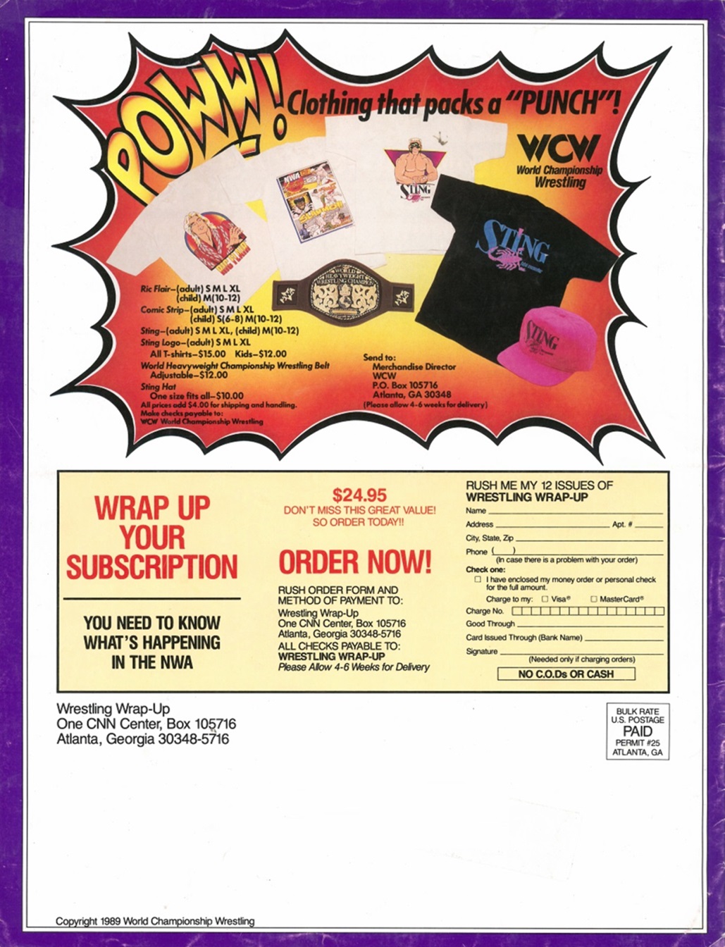 In this issue of Wrestling Wrap-Up, you get an article about the Z-Man’s undefeated steak, photos of the Dynamic Dudes, an Iron Man Word Search puzzle, and a bitchin’ piece ft. a futuristic robot Sting choking a cybernetic mist-spewing Muta! It’s World Championship Wrestling as interpreted by Japanese artist Hajime Sorayama!