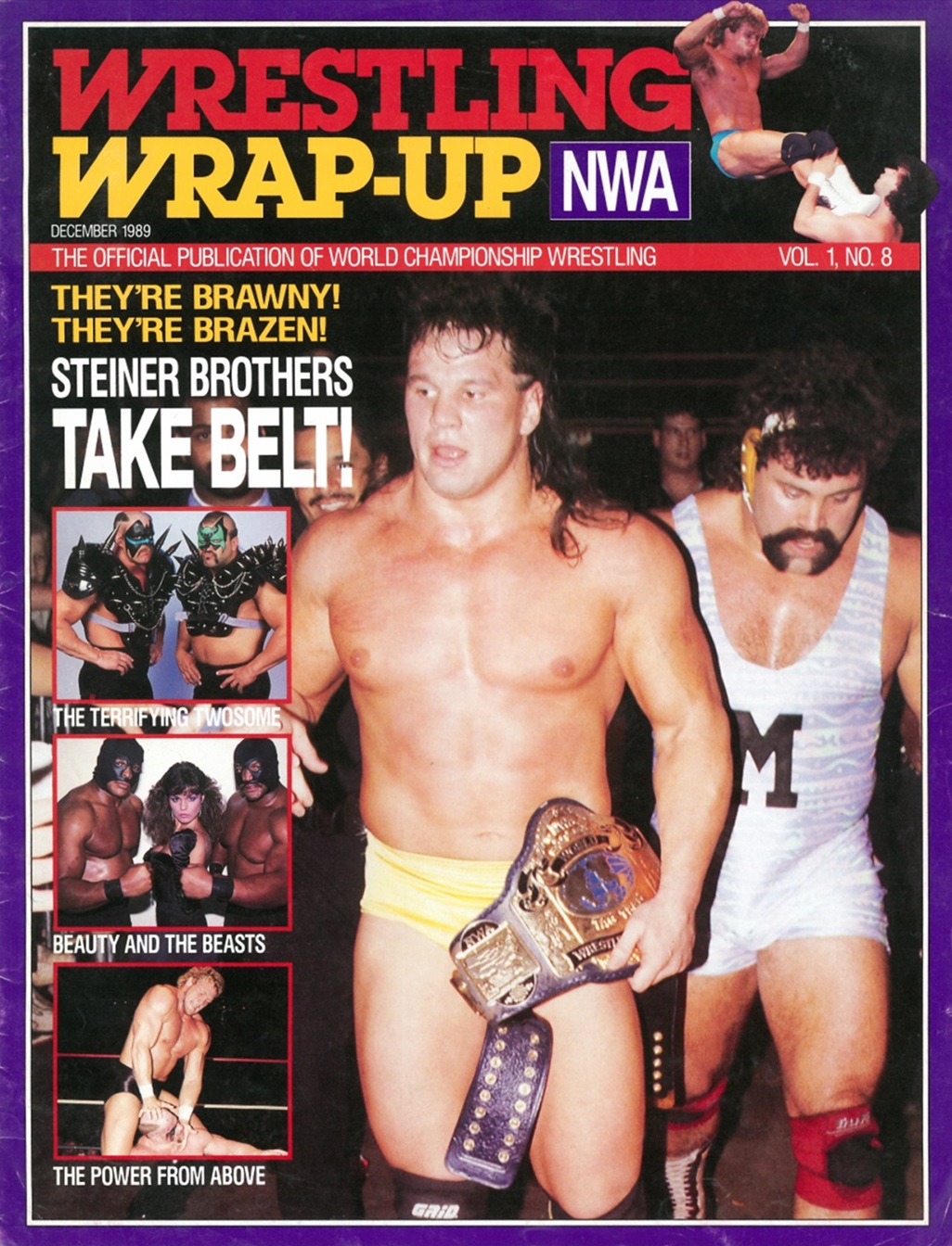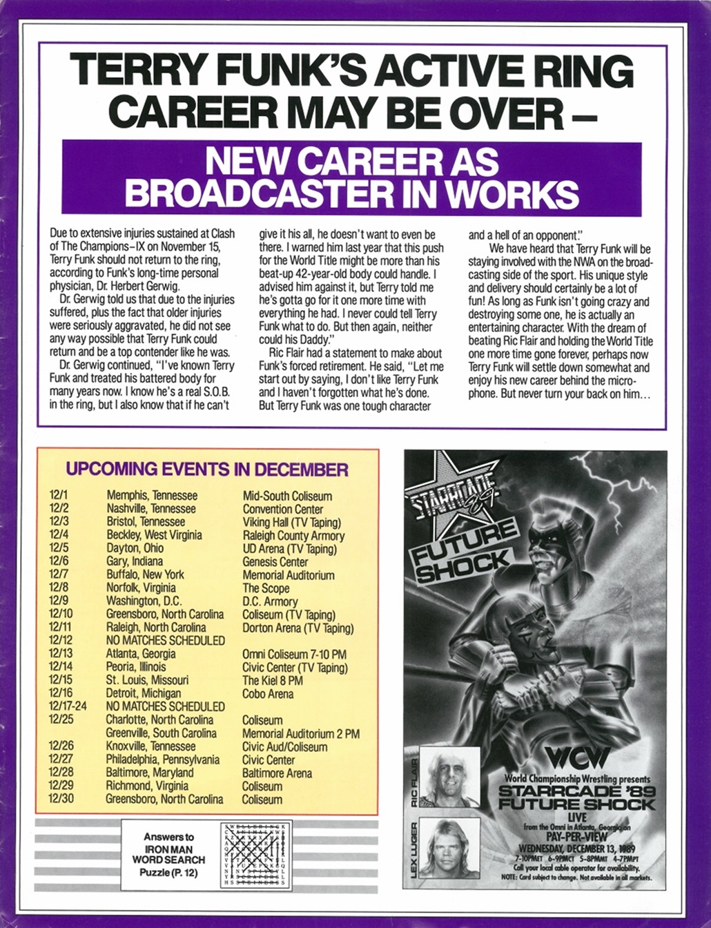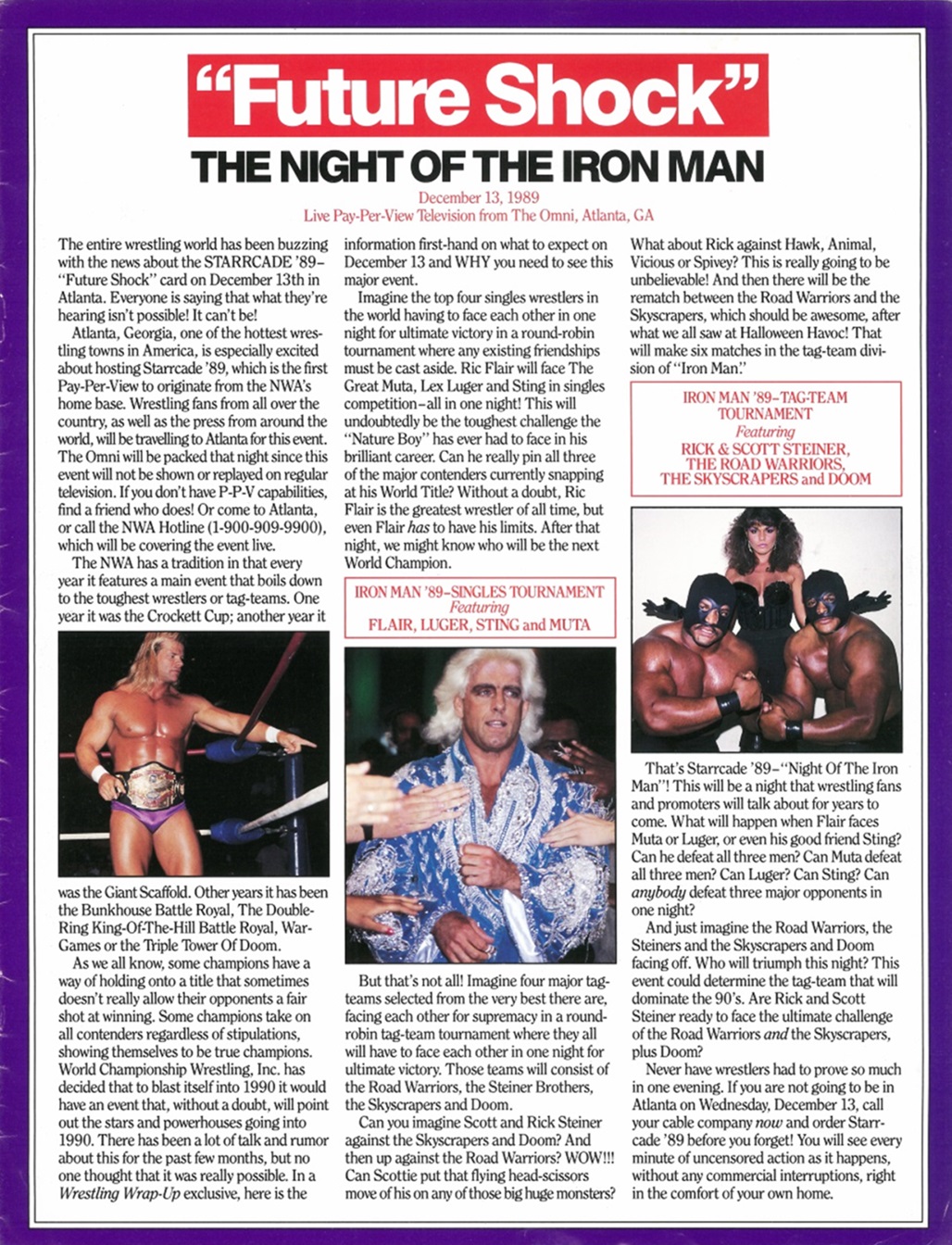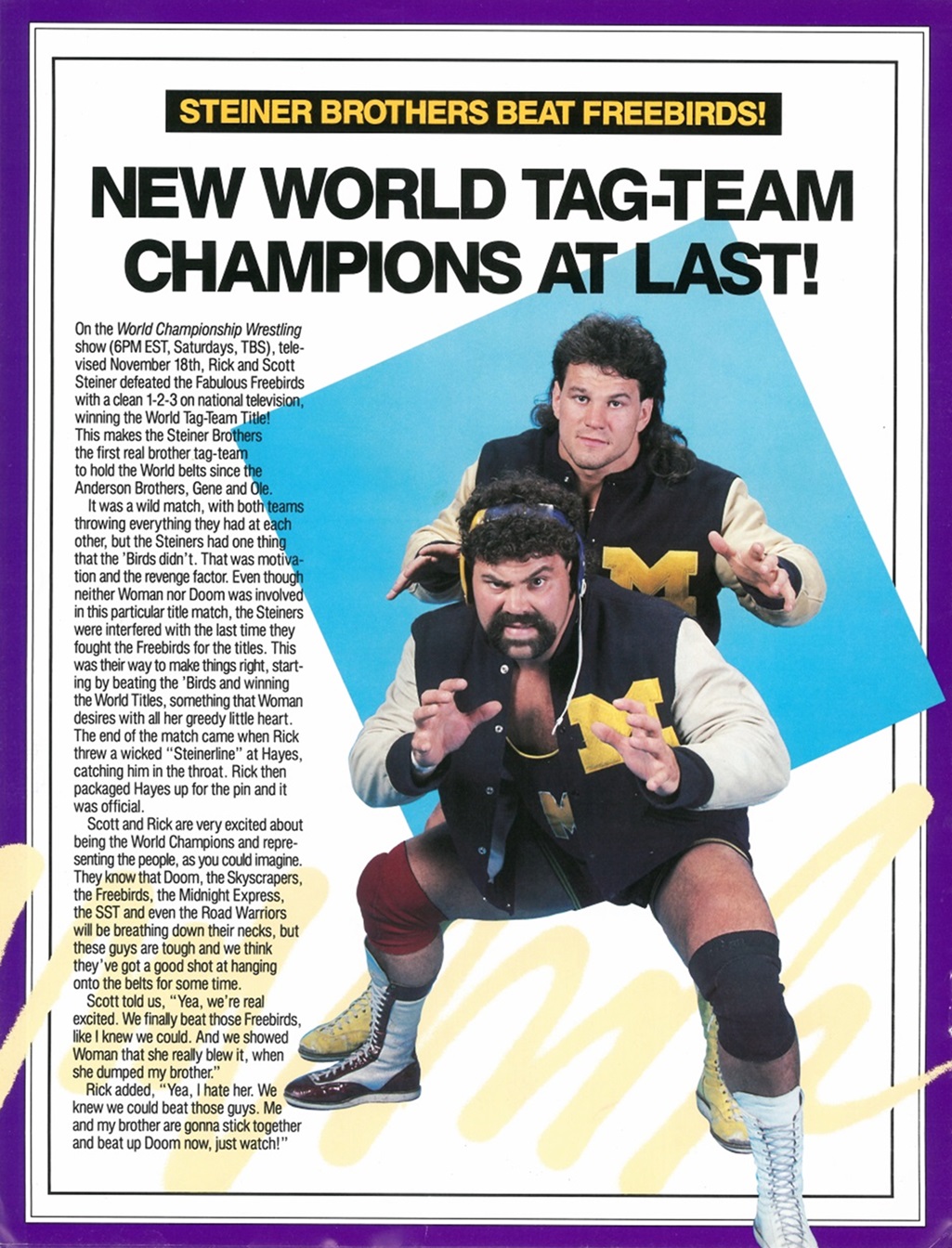 In this issue of Wrestling Wrap-Up, you get an article about the Z-Man’s undefeated steak, photos of the Dynamic Dudes, an Iron Man Word Search puzzle, and a bitchin’ piece ft. a futuristic robot Sting choking a cybernetic mist-spewing Muta! It’s World Championship Wrestling as interpreted by Japanese artist Hajime Sorayama!