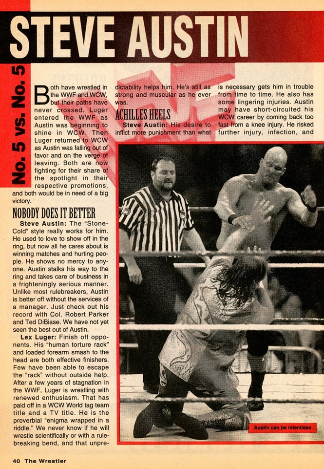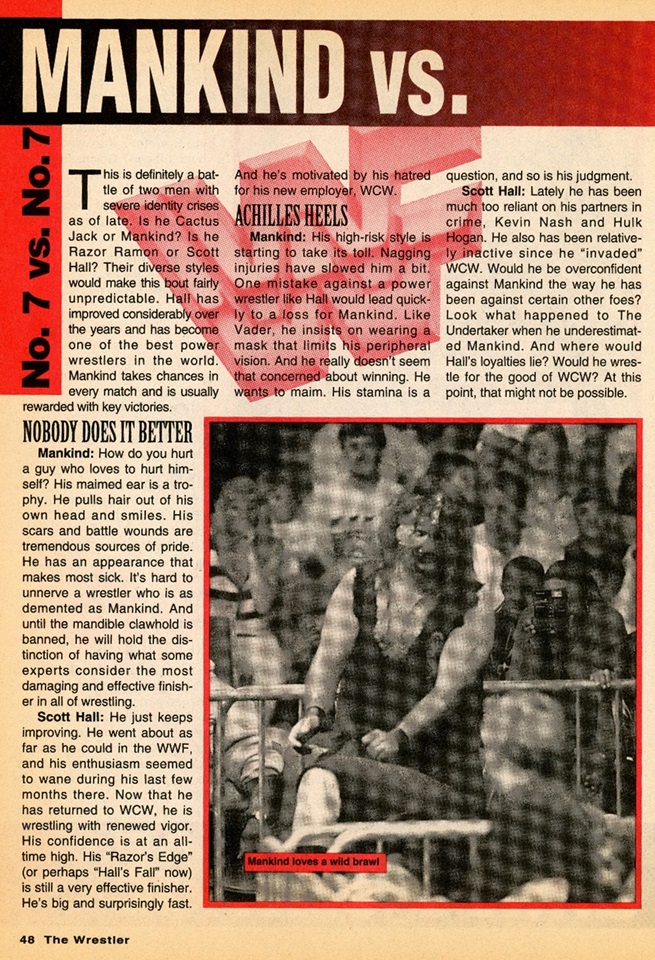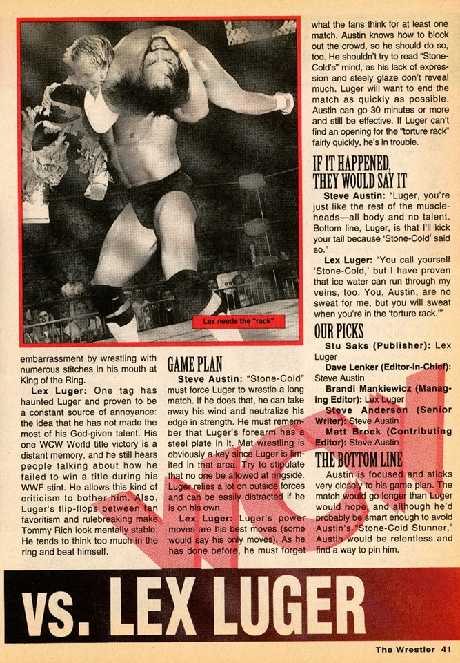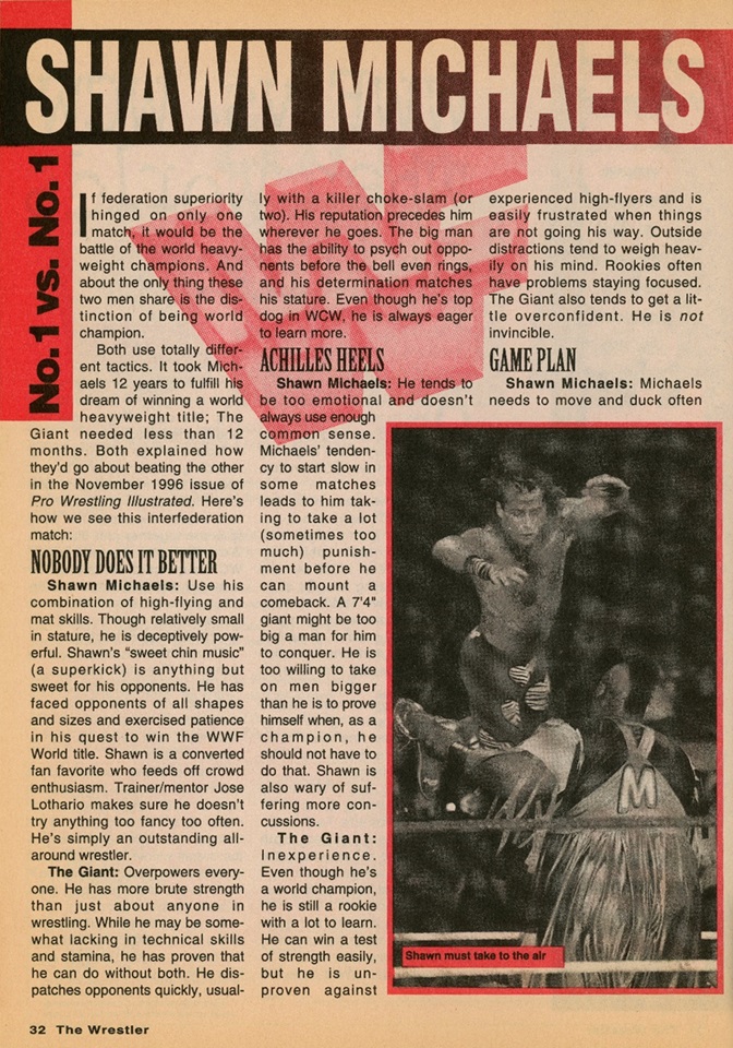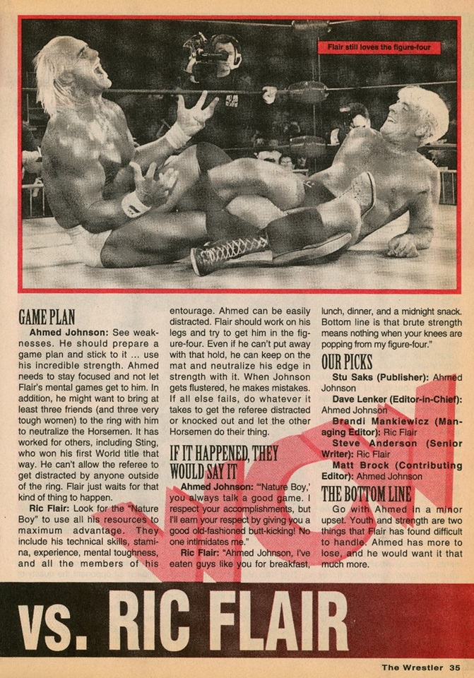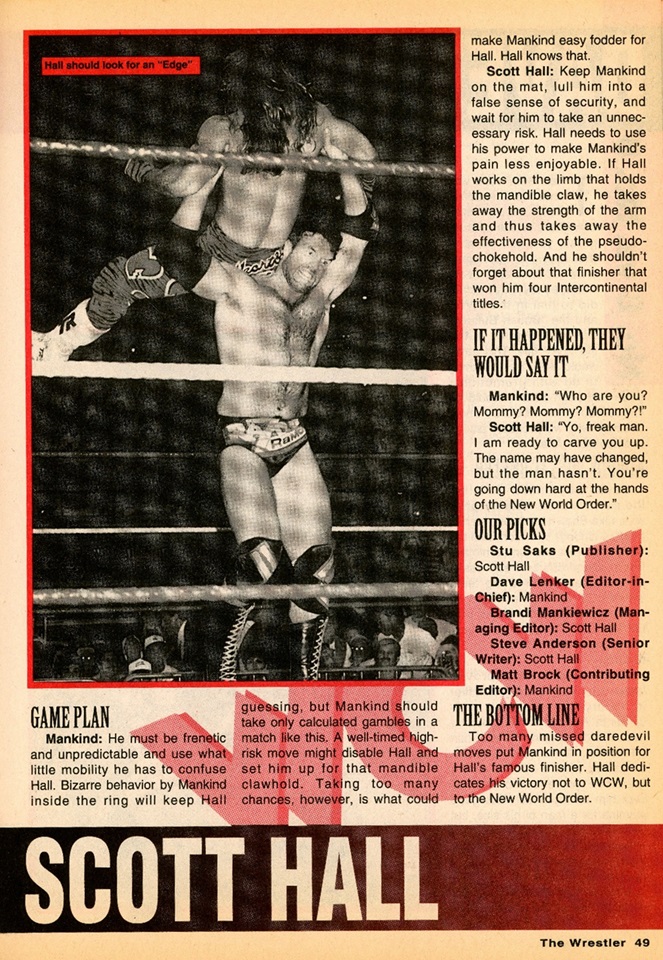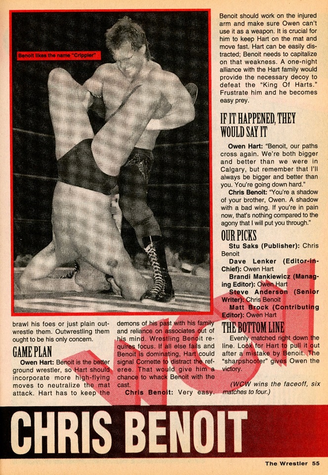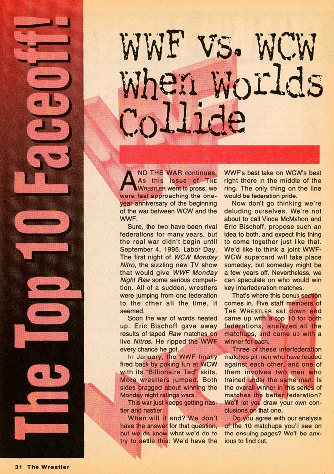 One of my favorite traditions from The Wrestler that used to run back in the day, the yearly WWF vs WCW feature complete with wrestler histories, individual weak points, and strategies you’d see deployed if these dream matches ever occurred. This time around though, four of the matches listed in this edition had already happened during the time of print (weird), but it’s still fun going through the speculation on how these bouts could play out.