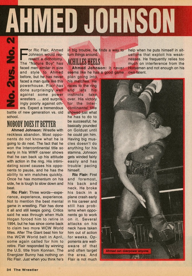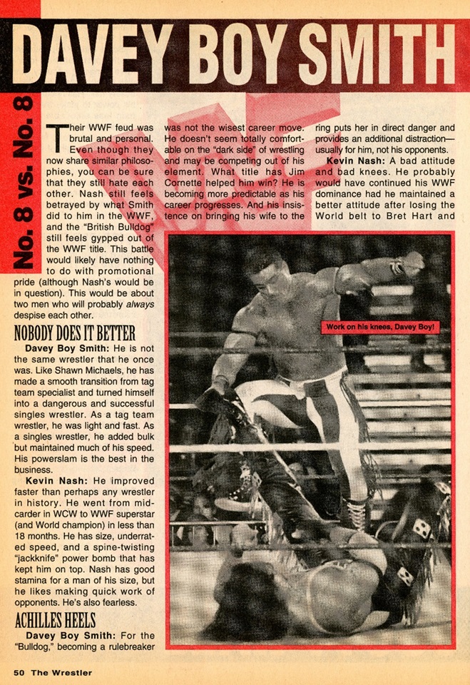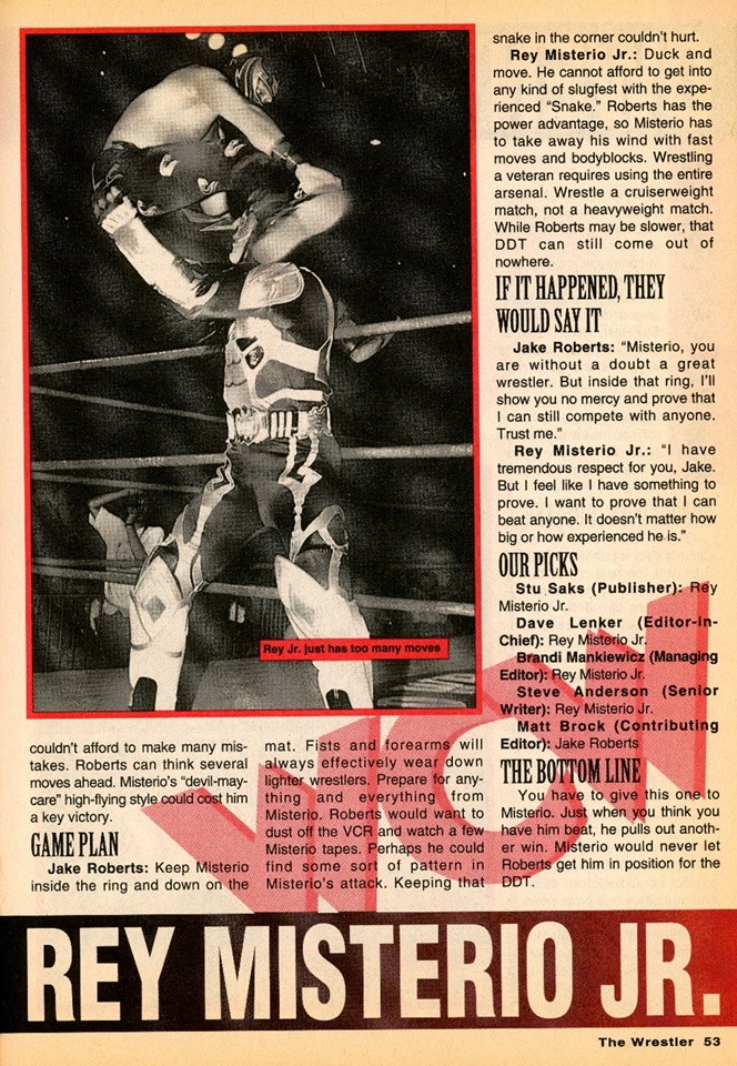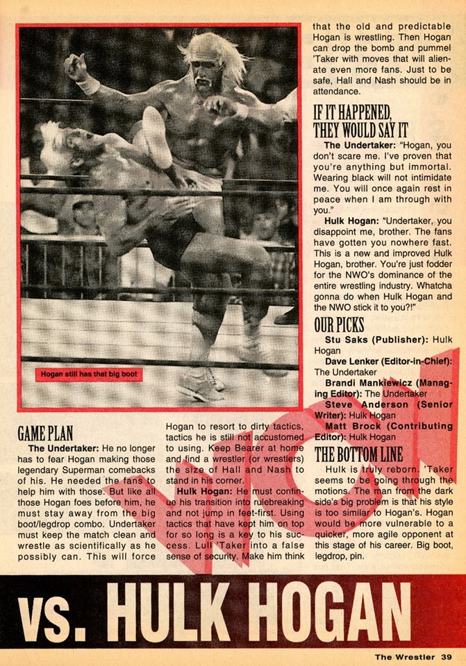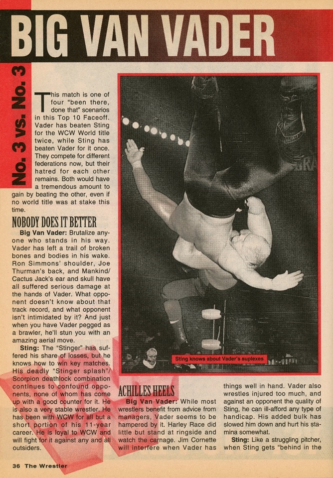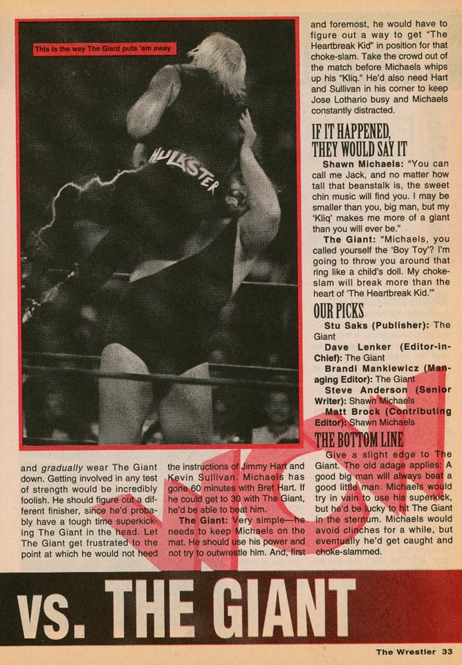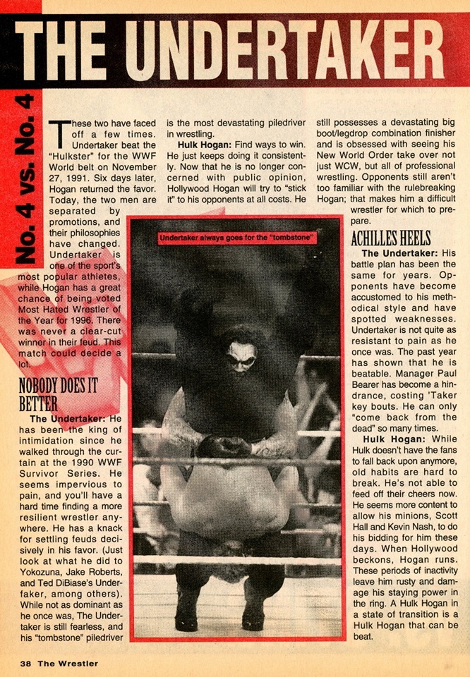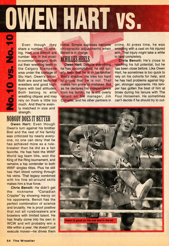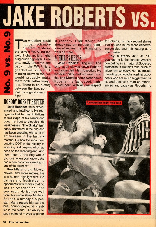 One of my favorite traditions from The Wrestler that used to run back in the day, the yearly WWF vs WCW feature complete with wrestler histories, individual weak points, and strategies you’d see deployed if these dream matches ever occurred. This time around though, four of the matches listed in this edition had already happened during the time of print (weird), but it’s still fun going through the speculation on how these bouts could play out.