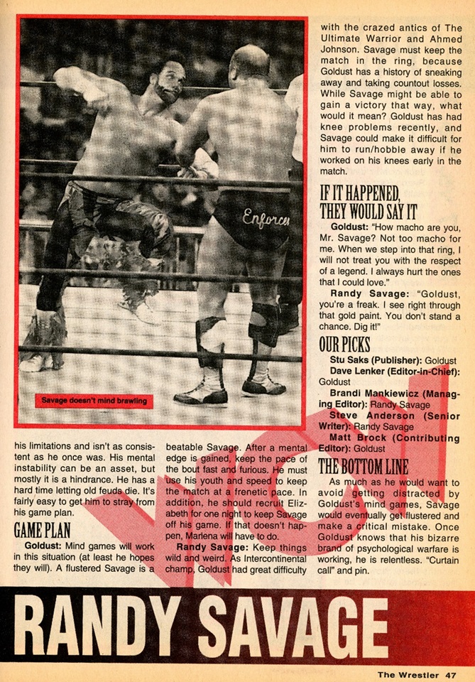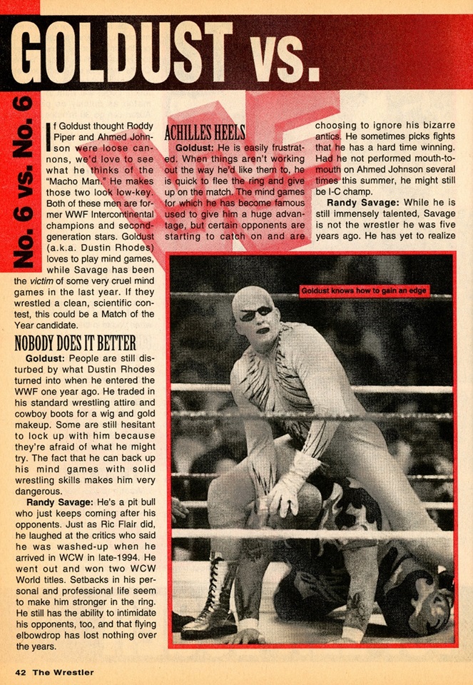 Also, there’s something enjoyable about reading a kayfabe wrestling magazine that’s writing out specific ways for a wrestler to beat another as if it’s a legitimate competition. When discussing a possible Goldust vs Randy Savage match-up, The Wrestler writes: