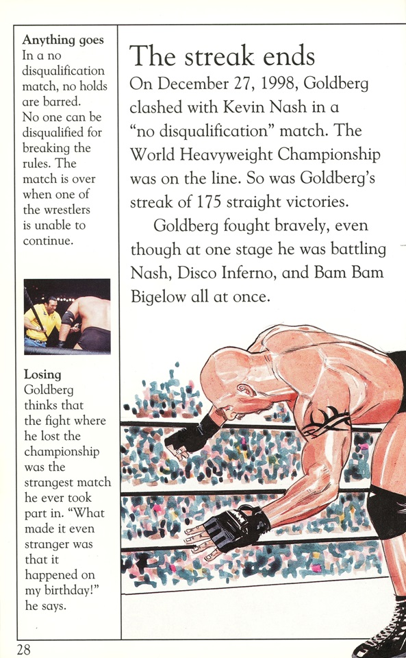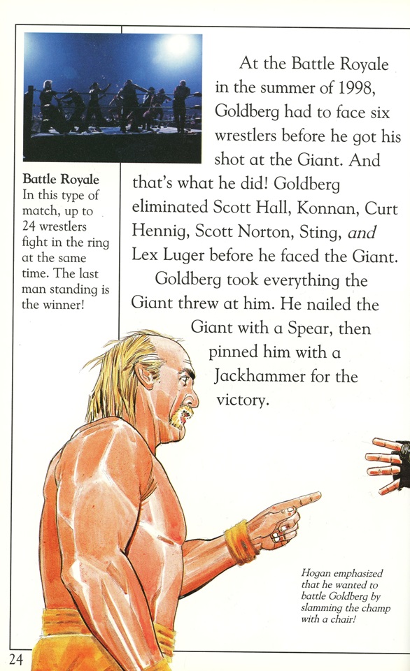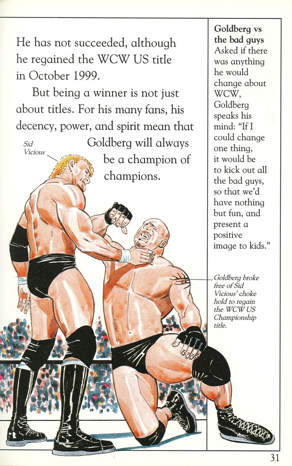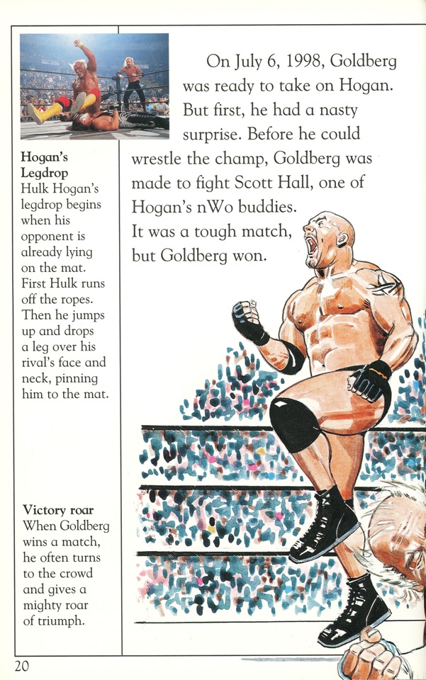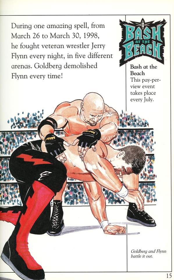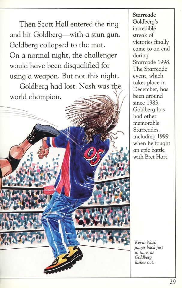 Anachronistic errors aside, the art pieces included in the DK Reader are the real highlights. Showing Goldberg side-kicking Kevin Nash’s head clean off is pretty sweet while “Lightning Foot” Jerry Flynn even gets the shine in his own illustration: