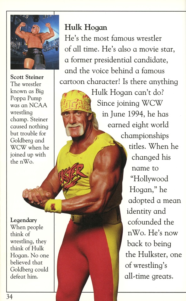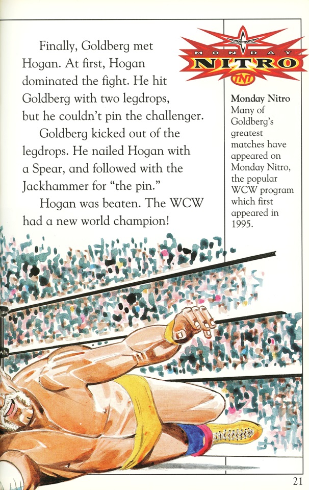 Major offense (okay, probably still a minor one) – Using an illustration of Hulk Hogan in his red/yellow Hulkster attire while discussing Goldberg winning the WCW World Heavyweight Championship in July 1998: